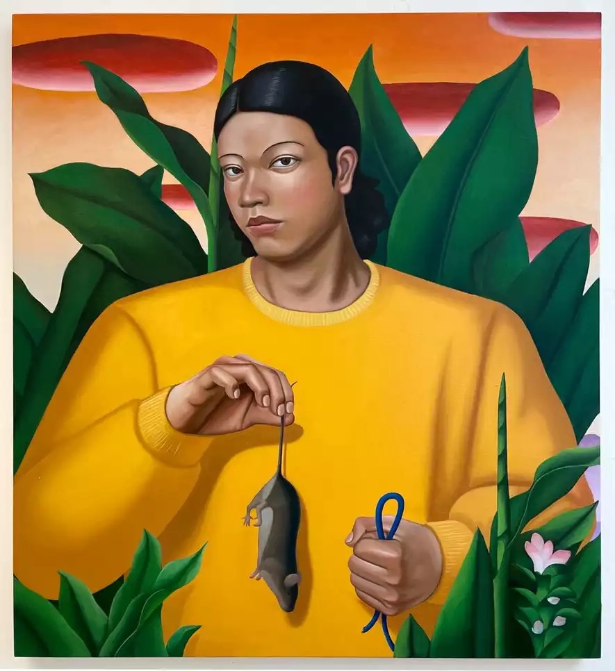 Tang Shuo lives and works in Liverpool. His initial interest was installation and materials art that he studied at the Central Academy of Fine Arts (CAFA) in Beijing, China. On moving to the United Kingdom in 2020, he turned solely to painting. His work explores memories of his childhood in rural Southern China, where tropical plants grow and which is home to many wild animals. The artist is always self-represented in his works, which echo figures from his past. When he moved to England, he had to face many changes adapting to a new lifestyle and had to rethink his country and his identity. In his work he questions the relationship between individuals and society, revealing a certain feeling of loneliness and alienation, with painting as a form of solace. Memory, identity and connection are important themes in his work.