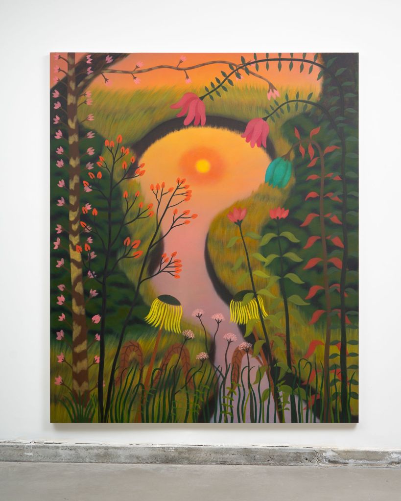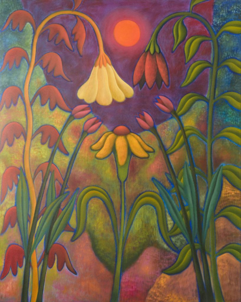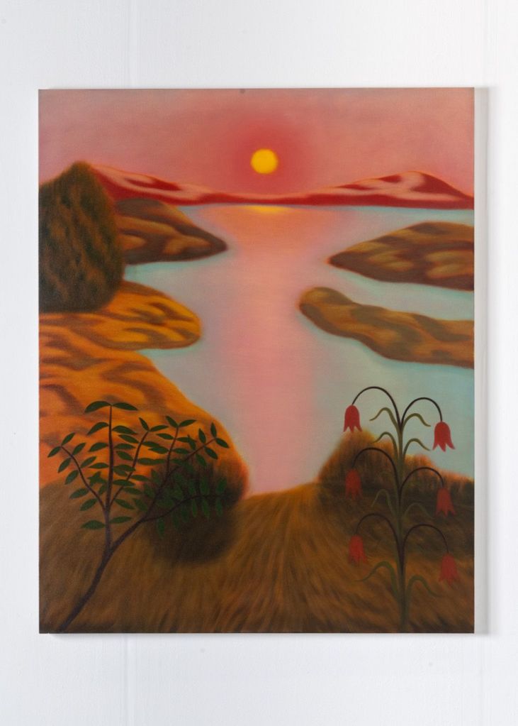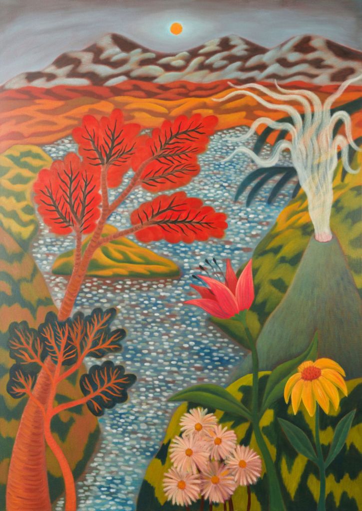 In her paintings, landscapes and flowers are sometimes merged with female bodies, and with the sun as a lactating breast. Portraying nature as sensual, even sexual, her work has been compared to that of Georgia O’Keeffe. There are also several paintings with naked woman reclining in nature, often with closed eyes. In Earth Dreamer (2023) a sleeping nude is laying on her side, arm folded under her head. Locks of her long hair meanders down into the orange, desert landscape and turns into blue streams of water. An earth goddess, perhaps, creating a world in her dreams.